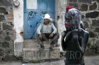 SAN NICOLÁS DE LOS RANCHOS, PUEBLA, 06MARZO2018.- En la tercera semana de cuaresma se realizó la tradicional fiesta del "adiós de la carne" en el poblado de San Nicolás de los Ranchos ubicado en las faldas del volcán Popocatépetl, donde hombres pintados o "Xinacates", recorren las calles con los cuerpos pintados a base de aceite comestible y pintura en polvo. Los "pintados" piden dinero intimidando a las personas que se encuentran a su paso´pal baño o la cerveza a cambio de no ser manchados. FOTO: HILDA RÍOS /CUARTOSCURO.COM