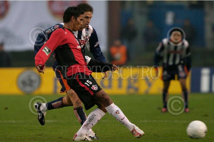 MONTERREY,N.L. 5 DE FEBRERO DE 2005.- Monterrey vs Atlas en juego de la jornada 4 del torneo Clausura, partido realizado en el estadio Tecnologico de esta ciudad, donde Monterrey consiguio la victoria por 1-0. El jugador de Altas Juan Pablo García disputa un balón con el jugador de Monterrey. FOTO:Jorge López/CUARTOSCURO.COM