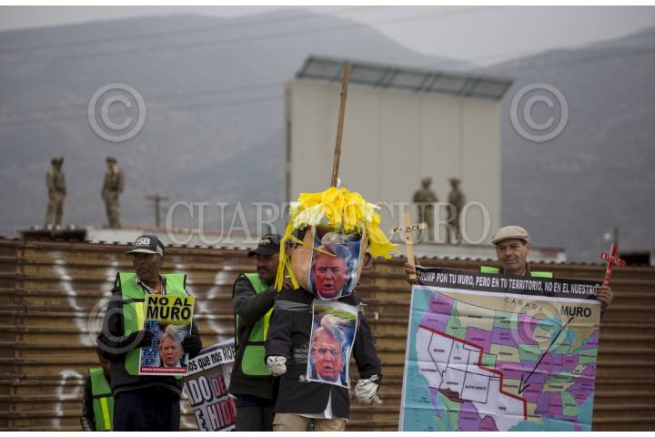TIJUANA, BAJA CALIFORNIA, 13MARZO2018.- En un fuerte operativo de seguridad por parte de México y Estados Unidos, el presidente de este país, Donald Trump acudió a la frontera para ver los ocho prototipos de lo que podría ser el próximo muro divisorio. Del lado mexicano colindante con la colonia las Torres, manifestantes asistieron para mostrar su inconformidad con el actual gobierno de Donald Trump, mientras que por el lado estadounidense se colocaron tractocamiones enfrente de los prototipos para obstaculizar que el presidente estadounidense sea visto desde el lado mexicano. FOTO: OMAR MARTÍNEZ /CUARTOSCURO.COM