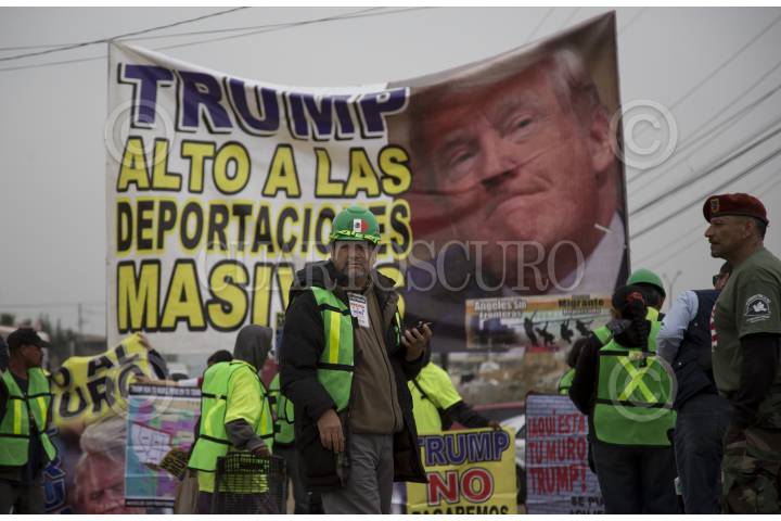 TIJUANA, BAJA CALIFORNIA, 13MARZO2018.- En un fuerte operativo de seguridad por parte de México y Estados Unidos, el presidente de este país, Donald Trump acudió a la frontera para ver los ocho prototipos de lo que podría ser el próximo muro divisorio. Del lado mexicano colindante con la colonia las Torres, manifestantes asistieron para mostrar su inconformidad con el actual gobierno de Donald Trump, mientras que por el lado estadounidense se colocaron tractocamiones enfrente de los prototipos para obstaculizar que el presidente estadounidense sea visto desde el lado mexicano. FOTO: OMAR MARTÍNEZ /CUARTOSCURO.COM