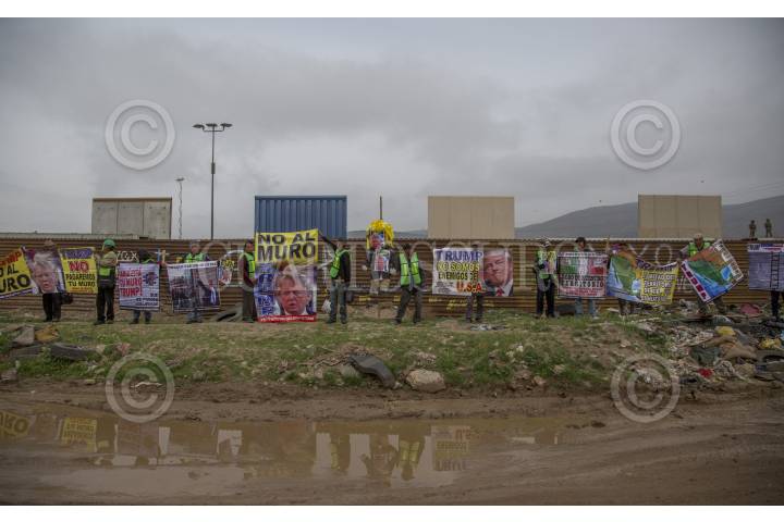 TIJUANA, BAJA CALIFORNIA, 13MARZO2018.- En un fuerte operativo de seguridad por parte de México y Estados Unidos, el presidente de este país, Donald Trump acudió a la frontera para ver los ocho prototipos de lo que podría ser el próximo muro divisorio. Del lado mexicano colindante con la colonia las Torres, manifestantes asistieron para mostrar su inconformidad con el actual gobierno de Donald Trump, mientras que por el lado estadounidense se colocaron tractocamiones enfrente de los prototipos para obstaculizar que el presidente estadounidense sea visto desde el lado mexicano. FOTO: OMAR MARTÍNEZ /CUARTOSCURO.COM