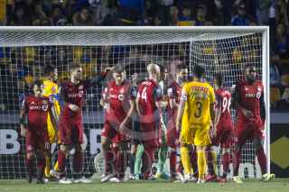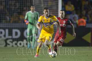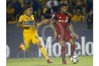 MONTERREY, NUEVO LEÓN, 13MARZO2018.- Javier Aquino del equipo de los Tigres de la UANL se disputa el balón con Gregory Van Der Wiel del equipo de Toronto durante el partido correspondiente a cuartos de final del torneo de la Liga de Campeones de la Concacaf 2018. Tigres se impuso 3 goles a 2 al equipo canadiense, sin embargo quedó eliminado de la siguiente fase por un marcador global de 4 a 4 siendo los goles del equipo visitante decisivos para la semifinal. FOTO: GABRIELA PÉREZ MONTIEL /CUARTOSCURO.COM