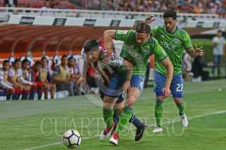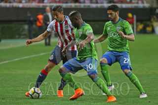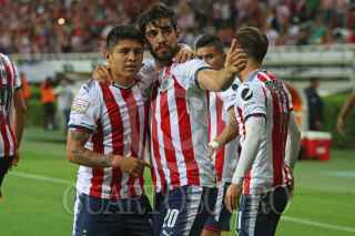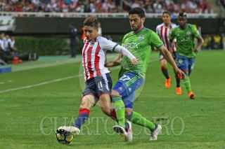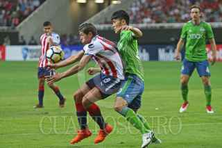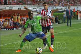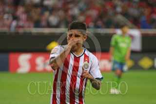 ZAPOPAN, JALISCO, 14MARZO2018.- Las Chivas de Guadalajara (México) se enfrentan a Seattle Sounders (Estados Unidos) en el Estadio Akron y en partido correspondiente a los Cuartos de Final de vuelta de la Liga de Campeones de la Concacaf. En la imagen Eduardo López y Rodolfo Pizarro jugadores de Chivas celebran la segunda anotación de su equipo. El marcador al final del encuentro fue de 3-0 a favor de equipo local. FOTO: FERNANDO CARRANZA GARCIA / CUARTOSCURO.COM