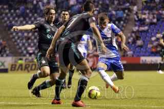 PUEBLA, PUEBLA, 16MARZO2018.- Christian Tabó disputa el balón ante sus contrincantes del Santos Laguna en partido correspondiente a la jornada 12 del torneo Clausura 2018 de la Liga MX celebrado en el estadio Cuauhtémoc con triunfo a favor de los visitantes. FOTO: HILDA RÍOS /CUARTOSCURO.COM