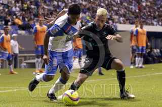 PUEBLA, PUEBLA, 16MARZO2018.- Los jugadores Andrés Cruz y Brian Lozano disputan el balón durante jugada del partido correspondiente a la jornada 12 del torneo Clausura 2018 de la Liga MX celebrado en el estadio Cuauhtémoc con triunfo a favor de los visitantes. FOTO: HILDA RÍOS /CUARTOSCURO.COM