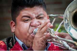 CIUDAD DE MÉXICO, 17MARZO2018.- Un músico de banda sopla con mucha fuerza el trombón, un instrumento de metal que produce su sonido gracias a la vibración de los labios del intérprete en la parte denominada boquilla. FOTO: DIEGO SIMÓN SÁNCHEZ /CUARTOSCURO.COM