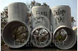 TEPOZTLAN, MORELOS, 21MARZO2018.- Pintas en contra de la ampliación de la autopista La Pera-Cuautla se pueden observar en los grandes tubos de drenaje que serán utilizados en la ampliación de esta vía. FOTO: MARGARITO PÉREZ RETANA /CUARTOSCURO.COM