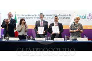 CIUDAD DE MÉXICO, 22MARZO2018.- Francisco Javier Acuña Llamas, comisionado presidente del INAI y Marcos Díaz-Santana Castaños, titular de la FEPADE, suscribieron el adendum al Programa Conjunto de Trabajo para prevenir y sancionar delitos electorales y actos de corrupción. FOTO: CUARTOSCURO.COM