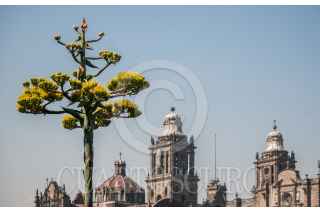 CIUDAD DE MÉXICO, 22MARZO2018.- El tallo floral de un maguey ubicado en la zona del Templo Mayor contrasta con la arquitectura de la catedral metropolitana en el centro histórico. Durante los últimos años se ha hecho un esfuerzo en la ciudad para que las décenas de construcciones no opaquen el paisaje verde que da oxigeno a la gente. FOTO: DIEGO SIMÓN SÁNCHEZ /CUARTOSCURO.COM