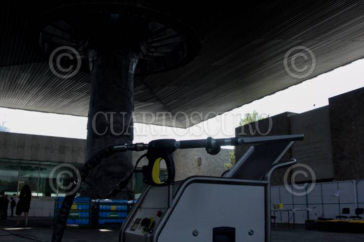 CIUDAD DE MÉXICO, 26MARZO2018.- Comenzaron los trabajos de limpieza del aluminio del conocido “Paraguas” del Museo Nacional de Antropología. Los trabajos se realizaran con hielo seco a presión y se calcula tardarán alrededor de dos meses en concluir, el mantenimiento es un donativo de las empresas de Kärcher y Praxair México. FOTO: GALO CAÑAS /CUARTOSCURO.COM