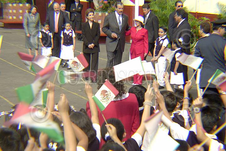 MEXICO, D.F. 24FEBRERO2005.- Vicente Fox Quesada, presidente de México, y Marta Sahagún de Fox, estuvieron presentes en la ceremonia de izamiento de bandera conmemorativa al día del lávaro patrio en la escuela primaria Benito Juárez. FOTO: Iván Stephens/CUARTOSCURO.COM