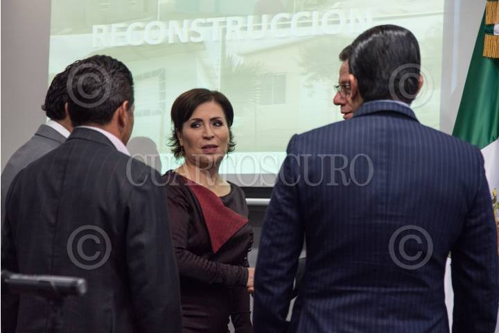 CIUDAD DE MÉXICO, 27MARZO2018.- Rosario Robles, secretaria de Desarrollo Agrario, Territorial y Urbano (SEDATU), informó en conferencia de prensa sobre el avance de la reconstrucción de viviendas en los estados después de los sismos de septiembre del año pasado. En el avance de acuerdo a la titular de la SEDATU, se han entregado el 95% de tarjetas por daño parcial y 95% por daño total; y el total de las viviendas en reconstrucción representa un avance del 75%, que corresponde a un total de 41 mil 364 viviendas. FOTO: MARIO JASSO /CUARTOSCURO.COM