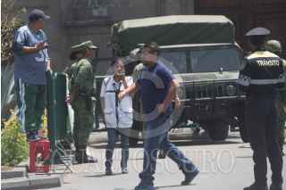CIUDAD DE MÉXICO, 29MARZO2018.- Entre militares y ofiales de tránsito, un hombre montado en un banco rojo vigila con radios en mano para avisar a los vendedores ambulantes de la zona en caso de que se aproxime un operativo policial en su contra. FOTO: TERCERO DÍAZ /CUARTOSCURO.COM