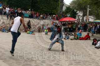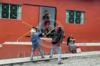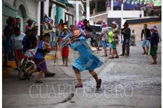 TLAQUILTENANGO, MORELOS, 30MARZO2018.-Los habitantes del pueblo de Huautla (situado al extremo sur del estado), participan de la celebración de Viernes Santo, cuya singularidad recae en un grupo que se denomina "Mototocos” (portando una máscara roja de edad antiquísima, y que son Judas, Barrabás y Batea, así como una mujer llamada Linterna o Mototoca) que recorre las calles y representa a los soldados romanos. Junto con los niños, los "Mototocos" azotan con varas largas a quienes los retan con un canto “Mototoco, viejo loco” o aventándoles agua. FOTO: MARGARITO PÉREZ RETANA /CUARTOSCURO.COM