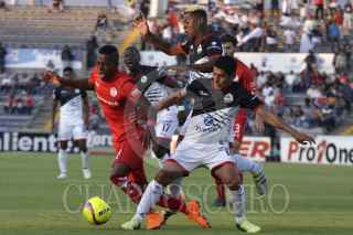 PUEBLA, PUE., 31MARZO2018.- Los jugadores Cristian Borja y Pedro Aquino, durante jugada de cabeza ante los Diablos Rojos de Toluca correspondiente a la jornada 13 del torneo Clausura 2018 de la Liga MX celebrado en el estadio olímpico universitario. FOTO: HILDA RÍOS /CUARTOSCURO.COM