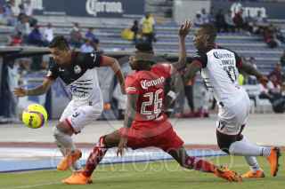 PUEBLA, PUE., 31MARZO2018.- Los jugadores Diego Jiménez, Cristian Borja y Luis Advíncula, durante jugada de cabeza ante los Diablos Rojos de Toluca correspondiente a la jornada 13 del torneo Clausura 2018 de la Liga MX celebrado en el estadio olímpico universitario. FOTO: HILDA RÍOS /CUARTOSCURO.COM