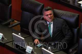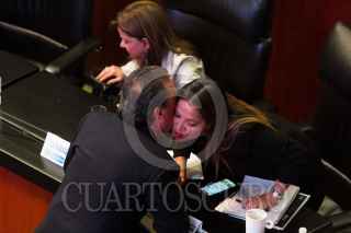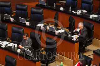 CIUDAD DE MÉXICO, 04ABRIL2018.- El coordinador priista Emilio Gamboa Patrón saluda a la senadora panista Andrea García García, durante la sesión en la Cámara de Senadores. FOTO: MOISÉS PABLO /CUARTOSCURO.COM