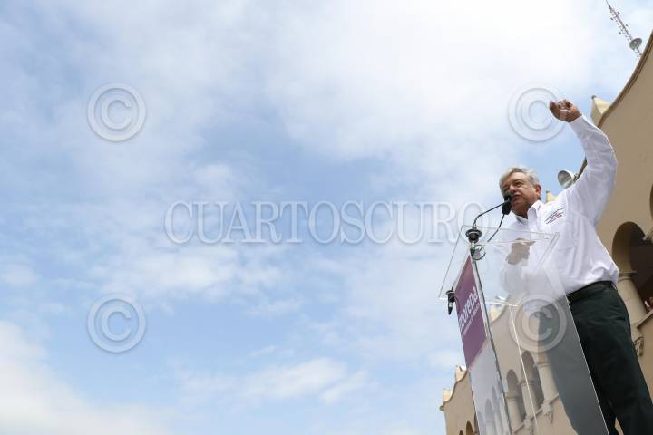 NUEVO LAREDO TAMAULIPAS, 05ABRIL2018.- Andrés Manuel López Obrador candidato de MORENA a la presidencia de la república, se reunió con militantes su partido en la plaza Hidalgo en la ciudad fronteriza de Nuevo Laredo para darles a conocer su proyecto de gobierno. FOTO: SAÚL LÓPEZ /CUARTOSCURO.COM