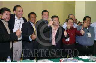 PUEBLA, PUEBLA, 03MARZO2005.- Felix Arturo González Canto, gobernador electo de Quintana Roo, Gustavo Reyes Baeza, gobernador de Chihuahua, Joaquín Hendrick, Ismael Hernández Deras, gobernador de Durango, Eduardo Bourns, gobernador de Sonora, Víctor Hurtado, gobernador de Campeche y Manuel Andrade, gobernador de Tabasco, durante la puesta en marcha de las mesas de trabajo de la 19 Asamblea Nacional de PRI. FOTO: Moisés Pablo/CUARTOSCURO.COM