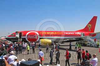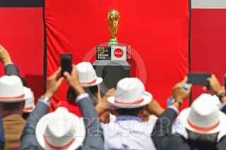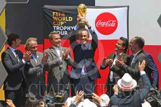 TLAJOMULCO DE ZUÑIGA, JALISCO, 09ABRIL2018.- Jorge Aristóteles Sandoval Díaz Gobernador del estado, Jorge Valdano ex futbolista campeón mundialista, Decio de María Presidente de la FEMEXFUT, entre otras personalidades encabezaron la llegada a territorio Mexicano del Tour del Trofeo de la Copa Mundial de la FIFA de Rusia 2018 que se llevo a cabo en el Aeropuerto Internacional Miguel Hidalgo y Costilla. FOTO: FERNANDO CARRANZA GARCIA / CUARTOSCURO.COM