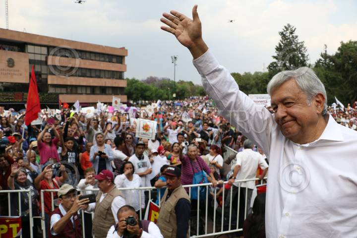 CIUDAD DE MÉXICO, 09ABRIL2018.- Andrés Manuel Lopez Obrador, candidato de MORENA a la presidencia de la república acompañado de Claudia Sheinbaum, candidata de MORENA a gobernadora de la Ciudad de México, durante un acto de campaña en el parque Cañitas ubicado en la delegacion Miguel Hidalgo. En la imagen el piloto de carreras Mario Dominguez asistió como invitado al mitin. FOTO: SAÚL LÓPEZ /CUARTOSCURO.COM