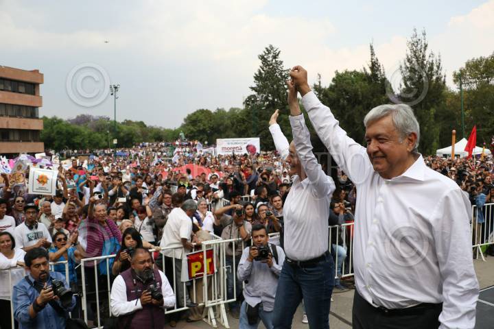 CIUDAD DE MÉXICO, 09ABRIL2018.- Andrés Manuel Lopez Obrador, candidato de MORENA a la presidencia de la república acompañado de Claudia Sheinbaum, candidata de MORENA a gobernadora de la Ciudad de México, durante un acto de campaña en el parque Cañitas ubicado en la delegacion Miguel Hidalgo. En la imagen el piloto de carreras Mario Dominguez asistió como invitado al mitin. FOTO: SAÚL LÓPEZ /CUARTOSCURO.COM