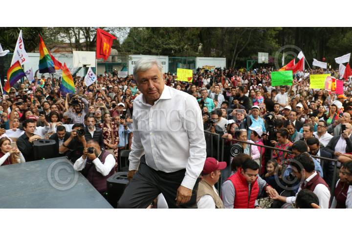 CIUDAD DE MÉXICO, 09ABRIL2018.- Andrés Manuel Lopez Obrador, candidato de MORENA a la presidencia de la república acompañado de Claudia Sheinbaum, candidata de MORENA a gobernadora de la Ciudad de México, durante un acto de campaña en el parque Cañitas ubicado en la delegacion Miguel Hidalgo. En la imagen el piloto de carreras Mario Dominguez asistió como invitado al mitin. FOTO: SAÚL LÓPEZ /CUARTOSCURO.COM