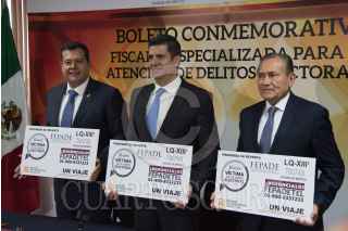 CIUDAD DE MÉXICO, 11ABRIL2018.- José Ramón Amueva, encargado de la Jefatura de Gobierno de la capital; Héctor Díaz Santana, Fiscal Especializado para la Atención de Delitos Electorales, y Jorge Javier Jiménez Alcaraz, director general del Sistema de Trasporte Colectivo Metro, develaron y presentaron el boleto del Metro en conmemoración del proceso electoral federal y local 2017-2018 de la FEPADE. FOTO: MARIO JASSO /CUARTOSCURO.COM