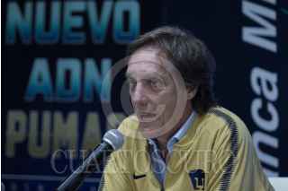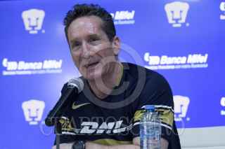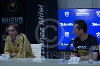CIUDAD DE MÉXICO, 12ABRIL2018.- Rodrigo Ares de Parga, presidente del Club Universidad Nacional, y Daniel Becker, director general del Grupo Financiero Mifel, presentaron una tajera bancaria con la imagen de los Pumas, la rueda de prensa se realizo en la cantera de entrenamiento. FOTO: GALO CAÑAS /CUARTOSCURO.COM