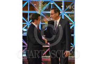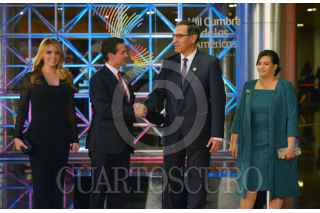 LIMA, PERÚ, 13ABRIL2018.- El Presidente de México, Enrique Peña Nieto, acompañado de su esposa, Angélica Rivera de Peña, acudió esta tarde a la ceremonia de inauguración de la VIII Cumbre de las Américas, en el Gran Teatro Nacional, en esta ciudad. FOTO: PRESIDENCIA /CUARTOSCURO.COM
