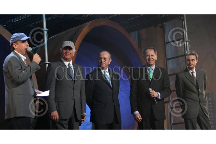 SAN LUIS POTOSI, SAN LUIS POTOSI14MARZO2005.- El periodista Joaquín López Dóriga recibe a Porfirio Muñoz Ledo, presidente del Centro Latinoamericano de Globalidad, quien ofreció una Conferencia magistral, dentro de Espacio 2005. FOTO: Nelly Salas/CUARTOSCURO.COM