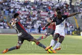 PUEBLA, PUEBLA, 14ABRIL2018.- Los jugadores Daniel Álvarez y Luis Advíncula disputan el balón durante jugada del partido entre Lobos BUAP y el Club Necaxa con marcador final 0-1 a favor de los visitantes, correspondiente a la jornada 15 del torneo Clausura 2018 de la Liga MX celebrado en el estadio olímpico universitario de la BUAP. FOTO: RÍOS /CUARTOSCURO.COM
