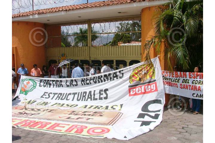 Chilpancingo, Guerrero, 14MARZO2005.- Integrantes de la Coordinadora Estatal de los Trabajadores de la Educacion en Guerrero (CETEG), encabezados por su lider Felix Moreno Peralta protestaron afuera de lña residencia oficial Casa Guerrero, para exigir le sea practicada una auditoria a la Secretaria de Educacion Guerrero (SEG) devido a la malversacion de fondos en que han incurrido funcionarios de dicha dependencia. Foto: Oscar Alvarado/CUARTOSCURO.COM