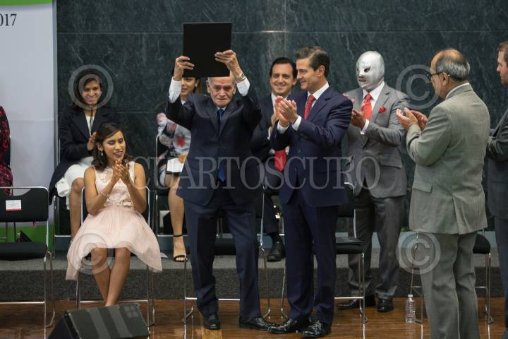 CIUDAD DE MÉXICO, 20ABRIL2018.- El Hijo del Santo y Enrique Peña Nieto, presidente de México, durante la ceremonia de entrega del Premio Nacional de Deportes y Premio Nacional de Mérito Deportivo 2017, realizado en la residencia oficial de Los Pinos. FOTO: ADOLFO VLADIMIR /CUARTOSCURO.COM