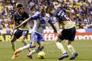 PUEBLA, 20ABRIL2018.- Los Jorge Enríquez, Benny Corona y Guido Rodríguez, disputan el balón durante jugada del partido entre el Club Puebla y las Águilas del América con marcador final 3-1 correspondiente a la jornada 16 del torneo Clausura 2018 de la Liga MX celebrado en el estadio Cuauhtémoc. FOTO: HILDA RÍOS /CUARTOSCURO.COM