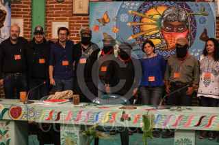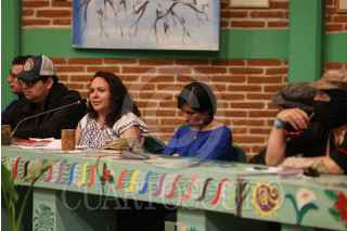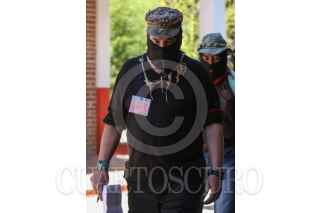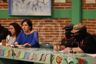 SAN CRISTOBAL DE LAS CASAS, 21ABRIL2018.- Luis Hernández Navarro, Emilio Lezama y Javier Risco, Subcomandante Galeano, Comandante Tacho, Subcomandante Moisés, Daniela Rea y Marcela Turati, durante la sexta sesión de actividades en el conversatorio "Miradas, escuchas, palabras: ¿prohibido pensar?", encuentro entre el Concejo Indígena de Gobierno, las redes de apoyo del CIG, periodistas y artistas y el Ejército Zapatista de Liberación Nacional (EZLN) para hacer una evaluación sobre el recorrido y la participación del CIG y Marichuy como aspirante a candidata independiente. FOTO: DALIRI OROPEZA /CUARTOSCURO.COM
