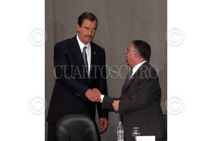 MEXICO, D.F., 15MARZO2005.- Vicente Fox Quesada, presidente de la República, Manlio Fabio Beltrones, diputado del PRI, Diego Fernandez de Cevallos, senador del PRI, Mariano Azuela Huitrón, presidente de la SCJN y Enrique Jackson, senador de PRI, durante la ceremonia de los 180 años de creación de la Suprema Corte de Justicia de la Nación, que se realizó en el Senado. FOTO: Moisés Pablo/CUARTOSCURO.COM