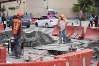 CIUDAD DE MÉXICO, 25ABRIL2018.- Obreros trabajan en el mejoramiento de la banqueta de avenida Juárez casi esquina con Bucareli, los peatones denuncian que esta obra ya lleva más de un mes y no la pueden concluir, causando molestia a los peatones. FOTO: BERNANDINO HERNÁNDEZ /CUARTOSCURO.COM