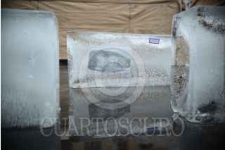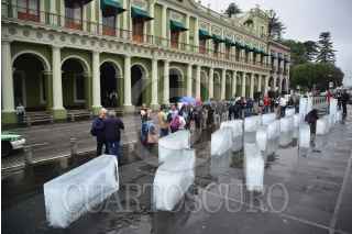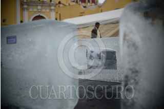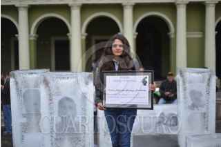 XALAPA, VERACRUZ, 28ABRIL2018.- Periodistas Integrantes del Colectivo Voz Alterna, y reporteros protestaron frente a palacio de gobierno de esta entidad a 6 años del asesinato de Regina Martinez, corresponsal de la revista Proceso en Veracruz. Se colocaron bloques de hielo con la imagen de los periodistas asesinados, 4 de ellos durante la actual administración FOTO: ALBERTO ROA /CUARTOSCURO.COM