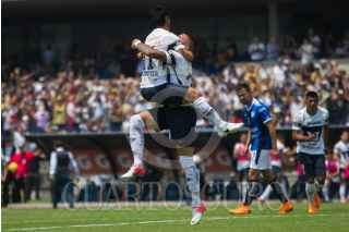 CIUDAD DE MÉXICO, 29ABRIL2018.- Matías Alustiza celebra su anotación con Nicolás Castillo, tanto que pone al frente 1-0 a los Pumas de la UNAM sobre los Gallos Blancos del Querétaro en el Estadio Olímpico. FOTO: MOISÉS PABLO /CUARTOSCURO.COM