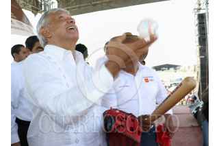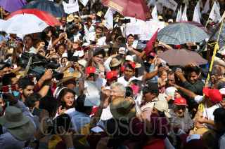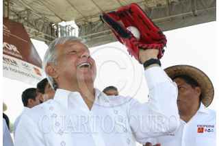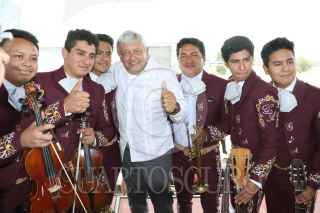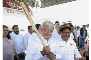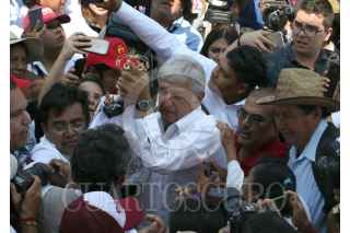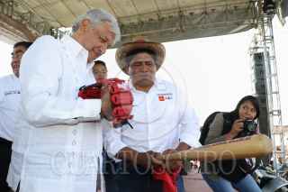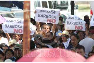 TEPEACA, PUEBLA, 30ABRIL2018.- Andrés Manuel López Obrador, candidato de MORENA a la presidencia de la república, se reunió con centenares de personas y simpatizantes de su partido en la central de abastos de Tepeaca donde dio a conocer su propuesta de gobierno. En la imagen algunos simpatizantes de morena en el estafo protestaron en contra del candidato a gonernador Miguel Barbosa Huerta. FOTO: SAÚL LÓPEZ /CUARTOSCURO.COM