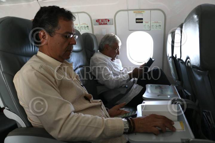 CIUDAD DE MÉXICO, 02MAYO2018.- Andrés Manuel López Obrador, candidato de MORENA a la presidencia de la república, lee durante un vuelo comercial, de la Ciudad de Mexico a Tampico Tamaulipas previo a su gira que realizara en ficho estado. FOTO: SAÚL LÓPEZ /CUARTOSCURO.COM