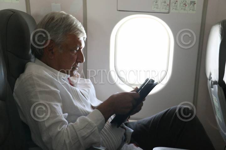 CIUDAD DE MÉXICO, 02MAYO2018.- Andrés Manuel López Obrador, candidato de MORENA a la presidencia de la república, lee durante un vuelo comercial, de la Ciudad de Mexico a Tampico Tamaulipas previo a su gira que realizara en ficho estado. FOTO: SAÚL LÓPEZ /CUARTOSCURO.COM