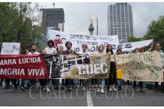 CIUDAD DE MÉXICO, 04MAYO2018.- Activistas y miembros de la Asamblea de Escuelas de Cine en CDMX; marcharon en silencio frente al Ángel de la independencia, para mostrar su solidaridad con las familias de los tres estudiantes de cine asesinados en Jalisco. También llamaron a las autoridades a esclarecer los casos de miles de desparecidos. FOTO: ANDREA MURCIA /CUARTOSCURO.COM