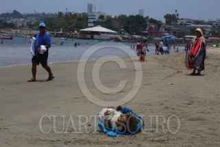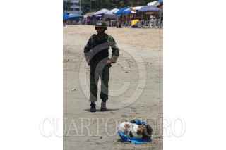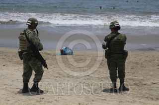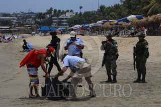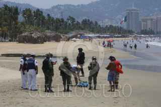 ACAPULCO, GUERRERO, 06MAYO2018.- La movilización de soldados, marinos y de policías causó el hallazgo de los restos de un animal decapitado y envuelto en tela azul que al mar arrastro hasta la playa Dominguillo en el puerto de Acapulco, junto con el animal se encontraban envueltos también los restos de una gallina, el hallazgo causo asombro entre la gente que se encontraba en la playa, al parecer los animales fueron sacrificados y arrogados al mar en un ritual, los restos fueron retirados de la playa por las autoridades. FOTO: CARLOS ALBERTO CARBAJAL /CUARTOSCURO.COM