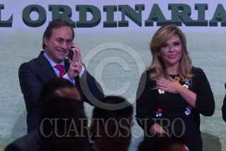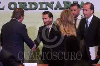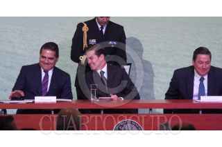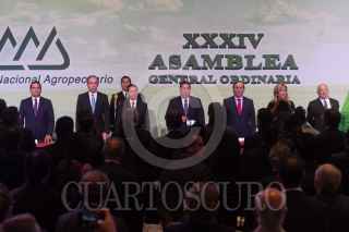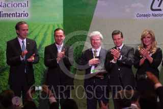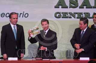CIUDAD DE MÉXICO, 08MAYO2018.- Bosco de la Vega, líder del Consejo Nacional Agropecuario (CNA); Enrique Peña Nieto, Presidente de México, y Baltazar Hinojosa Ochoa, titular de la Sagarpa, durante la Asamblea Ordinaria del Consejo Nacional Agropecuario. En la imagen el Jefe de Ejecutivo muestra el manual de "Atención Integral para Jornaleros Agrícolas Migrantes". FOTO: MOISÉS PABLO /CUARTOSCURO.COM