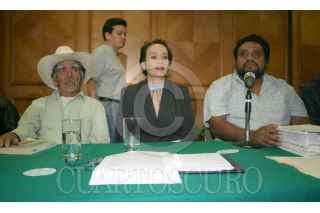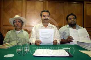 MEXICO, D.F. 04ABRIL2005.- Antonio Charles, representante del ejido el Modelo, en Abasolo Tamaulipas, Agustin Guerrero, y Miguel Angel Guzmán, abogado presentaron ante los medios de comunicacion una demanda por desacato que presentaran ante la PGR en contra del presidente Vicente Fox. FOTO:Nelly Salas/CUARTOSCURO.COM