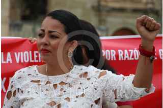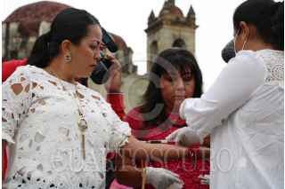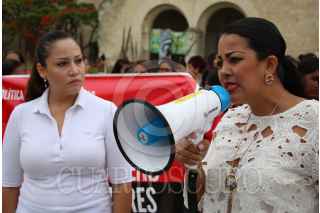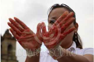 OAXACA, OAXACA, 09MAYO2018.- Saimy Pineda Velasco, quien fuera registrada por el Partido del Trabajo como candidata a la presidencia municipal de san Pedro Pochutla y después sustituida por Víctor Cruz quien busca reelegirse en el cargo, se manifestó este miércoles en la ciudad de Oaxaca al considerar que esta siendo víctima de violencia política contra las mujeres. En compañía de diversas féminas y la dirigente del Partido de Mujeres Revolucionarias (PMR), Guadalupe Díaz Pantoja se sacaron sangre y con ella pintaron diversas consignas en una manta. Pineda Velasco acusó que a Pineda Velasco y al comisionado Nacional del PT, actual senador con licencia y candidato a diputado federal, Benjamín Robles Montoya de haber falsificado documentación para reemplazarla. FOTO: ARTURO PÉREZ ALFONSO/ CUARTOSCURO.COM