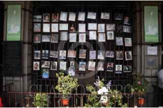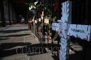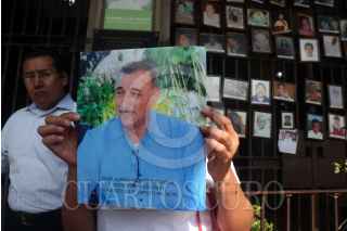 CUERNAVACA, MORELOS, 16MAYO2018.- Al cumplirse 427 días del secuestro agravado del profesor jubilado Albino Quiroz Sandoval, sus familiares colocaron una cruz de madera y su retrato en el Memorial de la Victimas en la entrada del Palacio de Gobierno. El profesor fue secuestrado el 16 de marzo en Tepoztlán, hay un hombre detenido por su participación en el delito, su familia exige un proceso justo. El cadáver de Albino no ha sido encontrado hasta hoy. FOTO: MARGARITO PÉREZ RETANA /CUARTOSCURO.COM