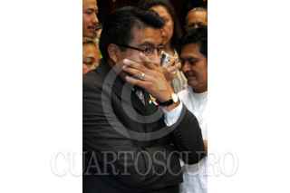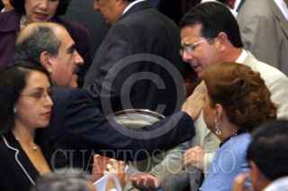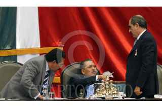 MEXICO, D.F. 05ABRIL2005.- Los diputados Pablo Gómez (PRD), Francisco Agustìn Arroyo (PRI) y Rebeca Godìnez (PRI), integrante de la Secciòn Instructora, platican durante la sesiòn en San Lázaro. FOTO: Sandra Perdomo/CUARTOSCURO.COM